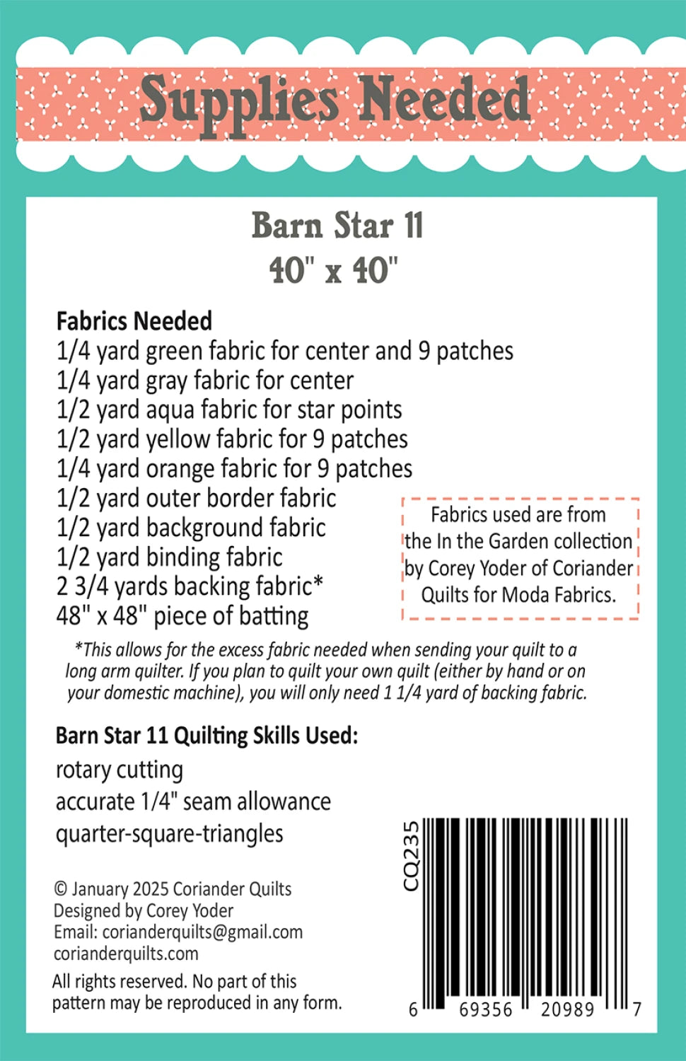 Barn Star 11 Quilt Pattern is backordered and will ship as soon as it is back in stock.