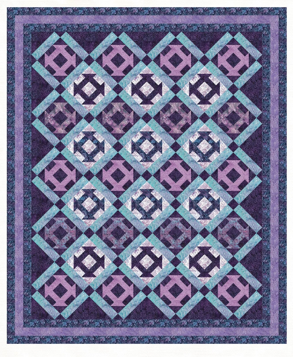 The Cogs Agog quilt pattern features a rich palette of purple, blue, and white. This pattern makes a finished size quilt approximately 69" x 83". The model is shown sewn in English Lavender fabrics by Island Batik.