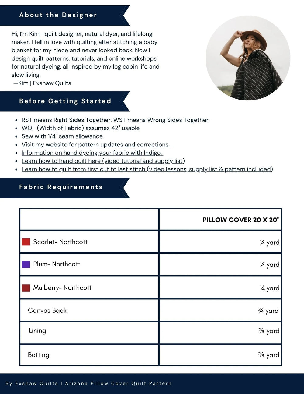 - Step-by-step instructions for making a finished 20" × 20" quilted pillow cover