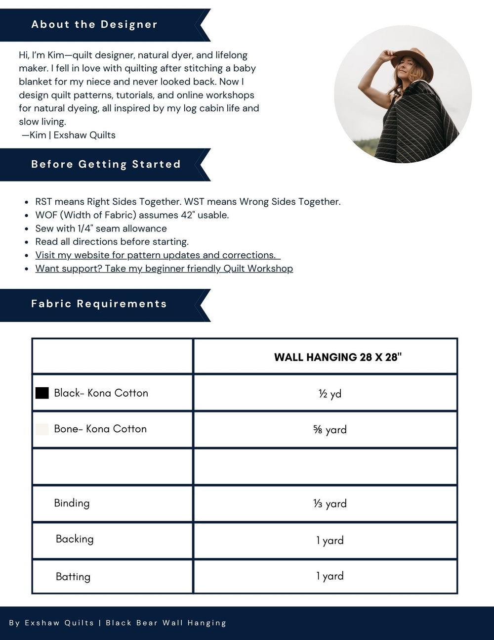 - All Exshaw Quilts patterns assume 42″ usable WOF and ¼″ seam allowance