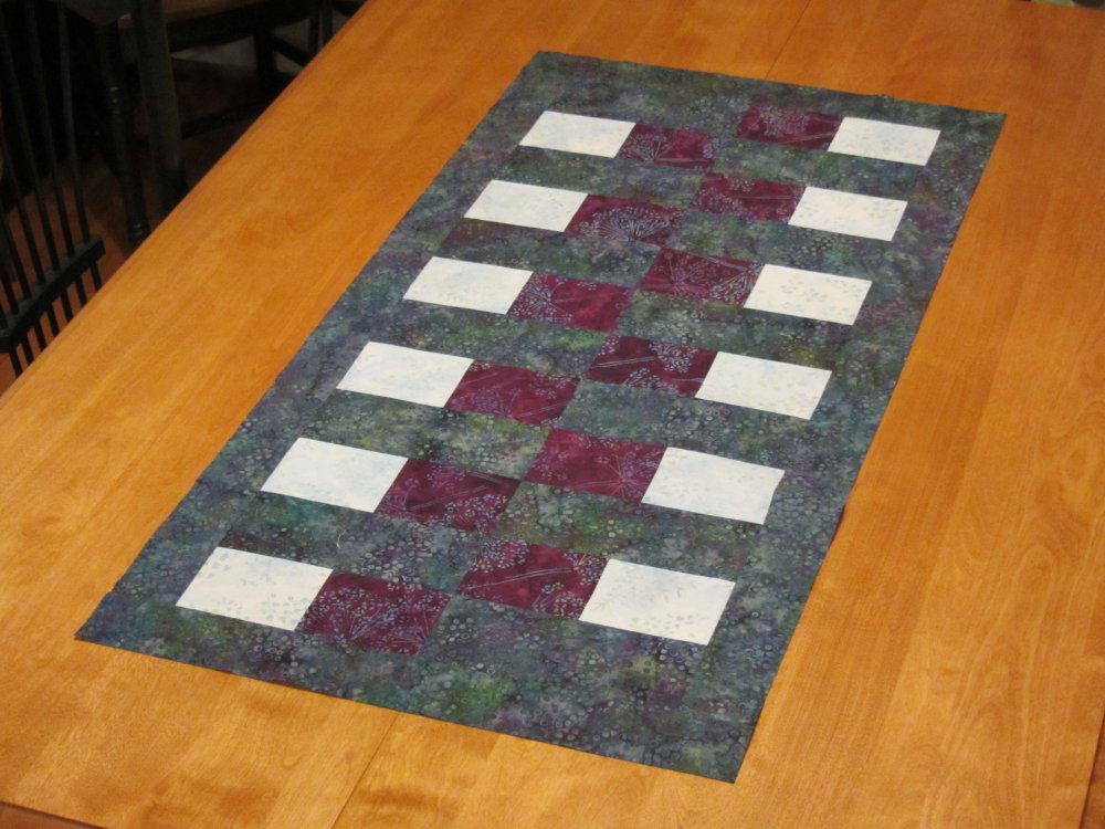 Bricklayers Daughter table runner card pattern 4-1/2in x 6-1/2in double sided color, finished size 20in x 40in . Easy to achieve brick pattern is great for beginners. Teaches making strip sets and cutting segments. Easy to kit with 3 fat quarter and yardage.