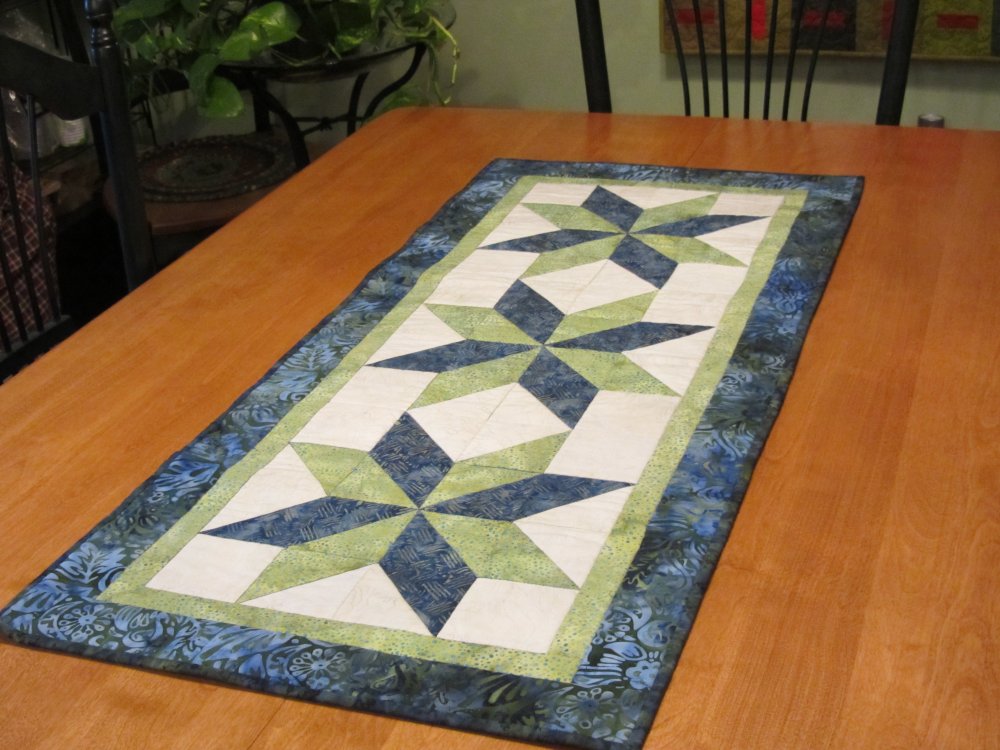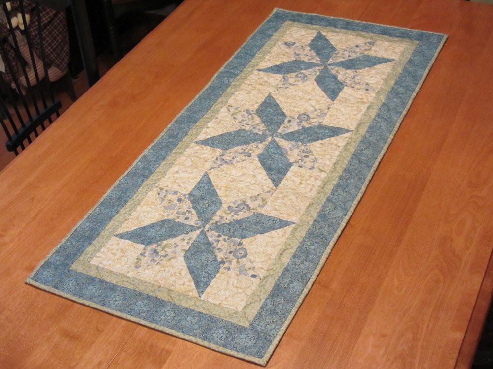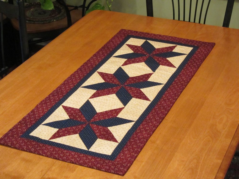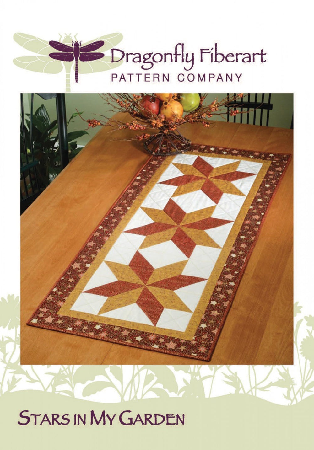Stars In My Garden table runner card pattern 4-1/2in x 6-1/2in double sided color, finished size 19in x 43in. Uses fat quarters and some yardage for kitting. Perfect for small to mid size prints and excellent for holiday prints.