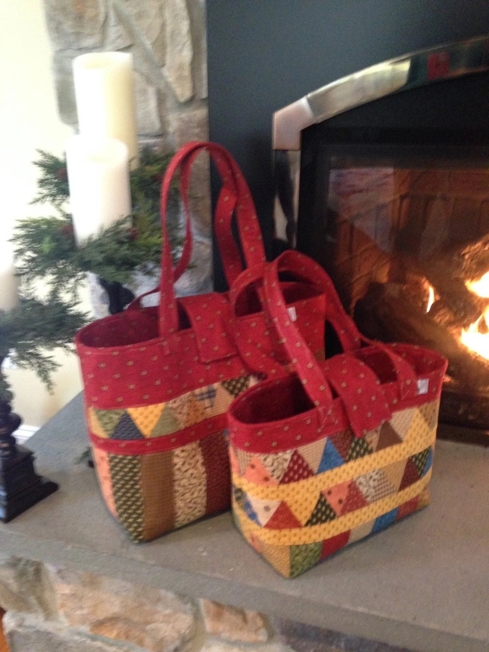 The Carolina Bag in two sizes: Small 12in x 11in x 5in Large 15in x 13in x 5in printed on 11in x 17in double sided color and folded twice in 6in x 9in hang bag. Inset 60 degree triangles and strips create this beautiful bag. Get creative with 2-1/2in strips or cut from fat quarters. Every bag comes out unique!  Both sizes have 6 pockets on the inside and sturdy, removable base inserts.