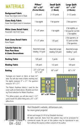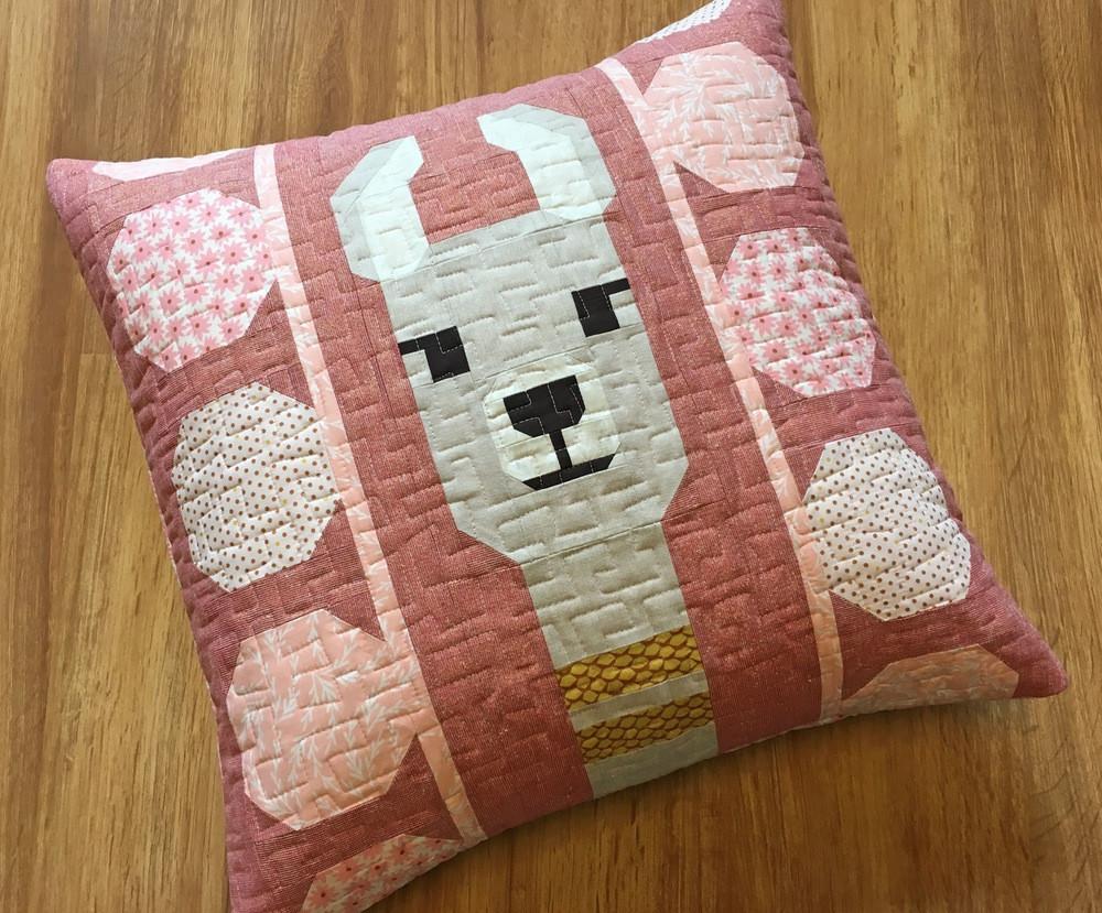 Lloyd & Lola are friendly large-scale llama blocks, complete with pieced blankets and decorations. The large and small quilt designs in this pattern also include festive pieced ball fringe. The pattern also includes a 20in x 20in pillow pattern, featuring a llama face and more pieced ball fringe. All projects are made using conventional patchwork techniques. No paper piecing! The pattern includes a complete list of the cut pieces need to make a single block, making it easy to use scraps or make single blocks for other projects.