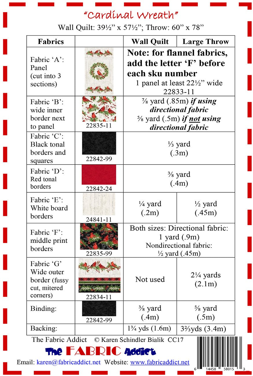 Cardinal Wreath quilt pattern uses a panel, and comes in two sizes: Large Throw-60 x 78; Wall Quilt-39 1/2 x 57 1/2