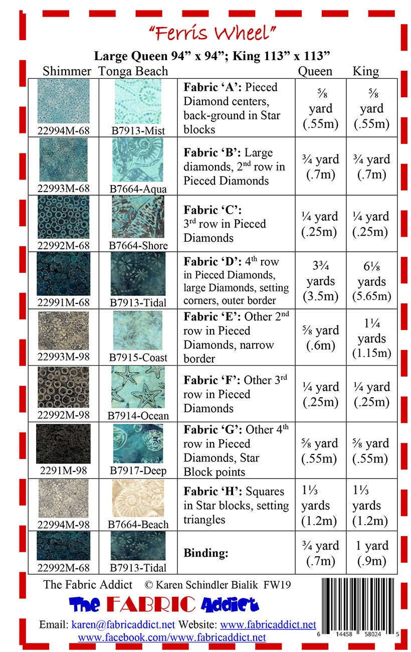 Ferris Wheel quilt pattern. Two sizes - Large Queen: 93 x 93; King: 113 x 113. Features Timeless Treasures Tonga Batik Treat Beach