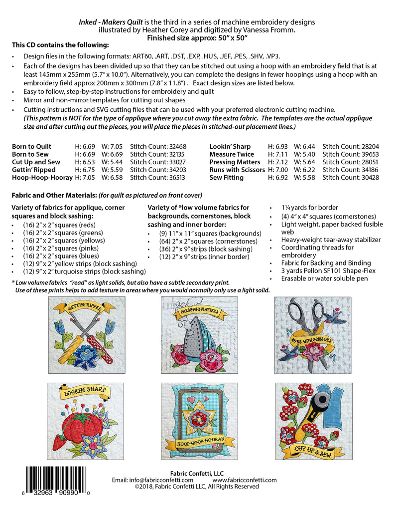 Inked - Makers Quilt is the third in a series of machine embroidery designs illustrated by Heather Corey and digitized by Vanessa Fromm.