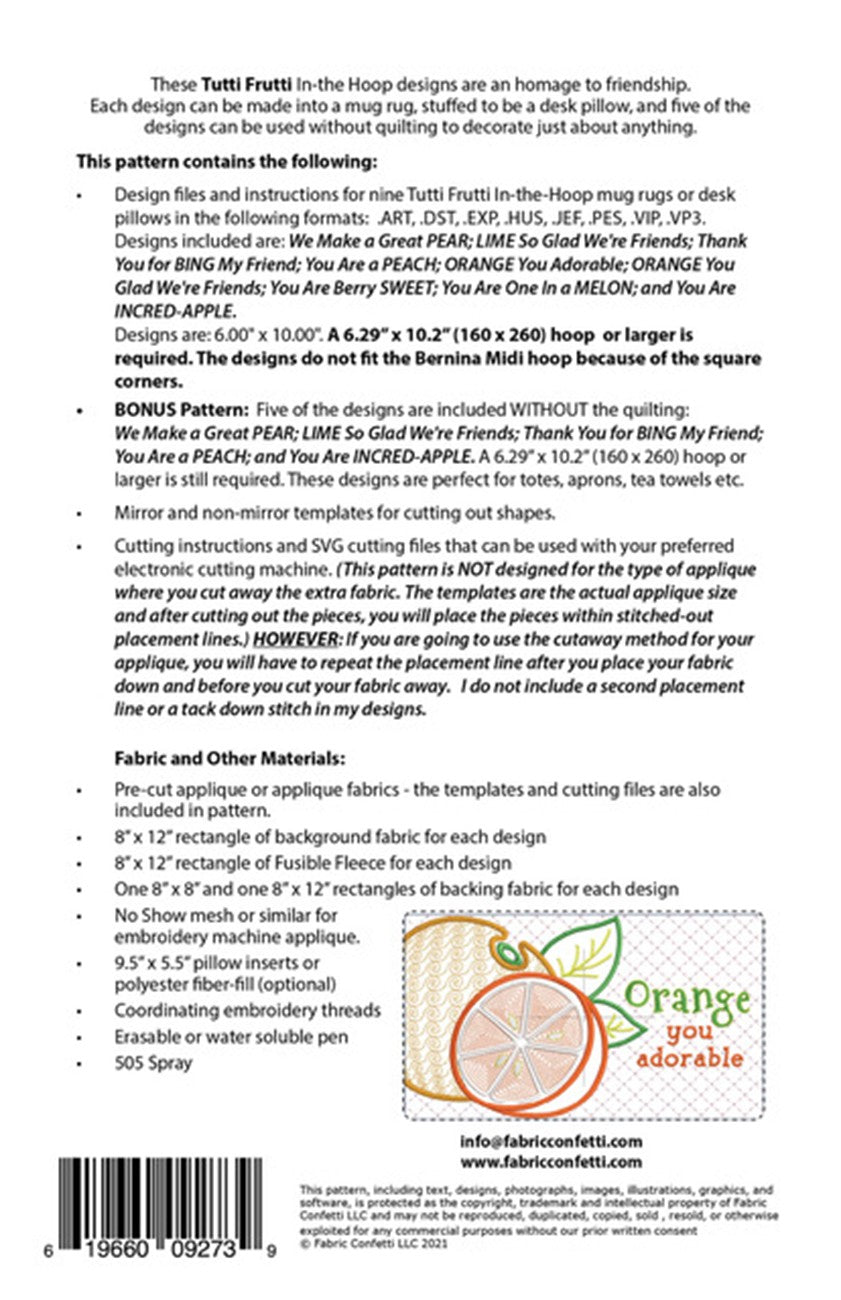 These Tutti Frutti In-the-Hoop designs are an homage to friendship. Each design can be made into a mug rug, stuffed to be a desk pillow, and five of the designs can be used without quilting to decorate just about anything. This pattern contains the following: Design files and instructions for nine Tutti Frutti In-the-Hoop mug rugs or desk pillows in the following formats:. ART, .DST, .EXP, .HUS, .JEF, .PES, .VIP, .VP3