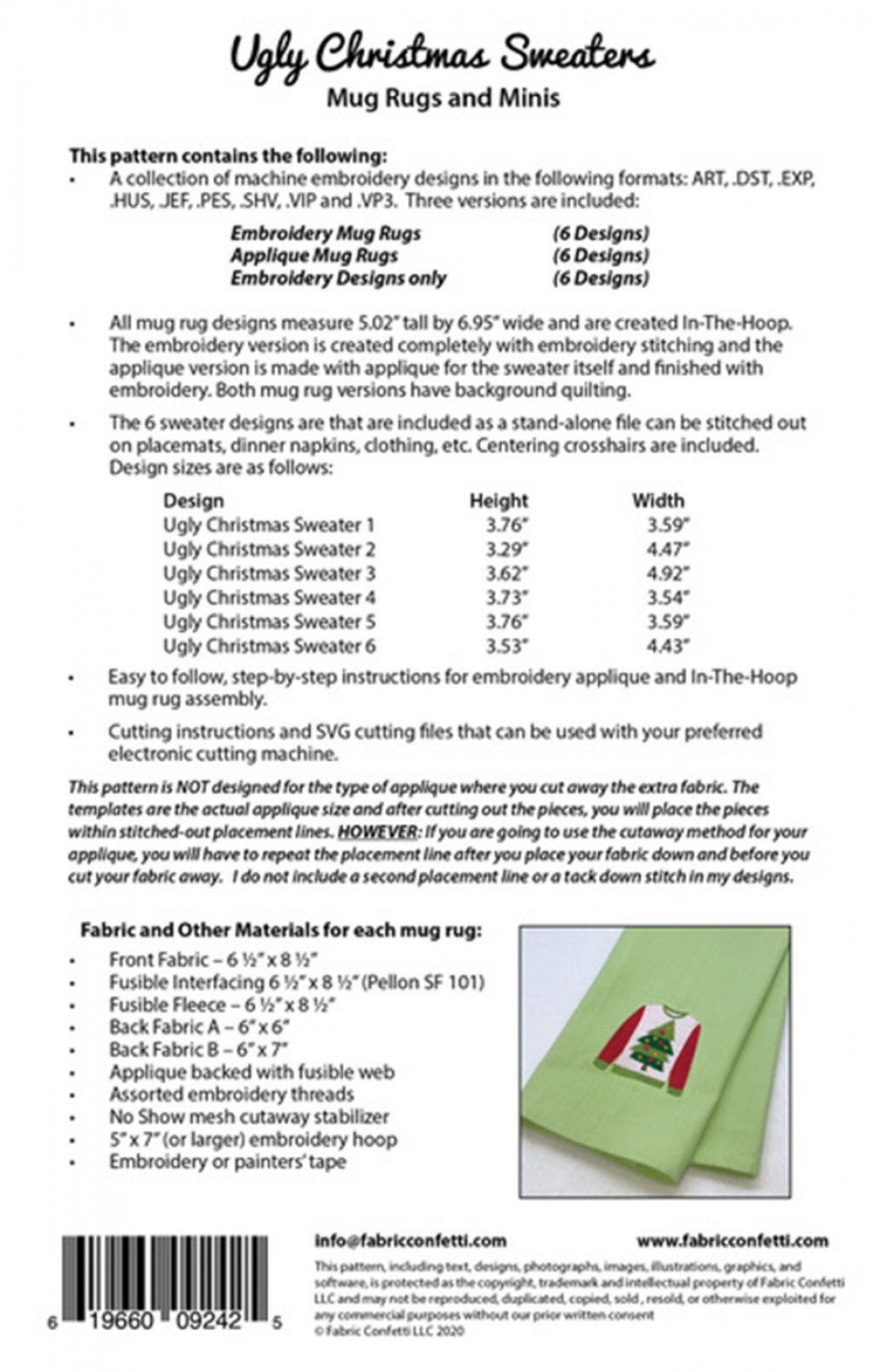 Both mug rug versions have background quilting. The six sweater designs are also included in an embroidery only version and can be stitched out on napkins, place-mats, aprons etc. Centering cross-hairs are included. Embroidery only designs are approx 4" x 5".