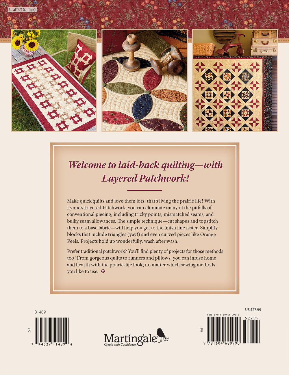 Make quick quilts and love them lots--that's living the prairie life! With Lynne's Layered Patchwork, you can eliminate many of the pitfalls of traditional piecing, including tricky points, mismatched seams, and bulky seam allowances. The simple technique--cut shapes and topstitch them to a base fabric--will help you get to the finish line faster. Simplify blocks that include triangles (yay!) and even curved pieces like Orange Peels. Projects hold up wonderfully, wash after wash. Prefer traditional patchwork? You'll find plenty of projects for those methods too! From gorgeous quilts to runners and pillows, you can infuse home and hearth with the prairie-life look, no matter which sewing methods you like to use.