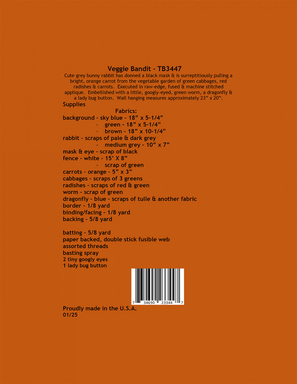 Cute grey bunny rabbit has donned a black mask & is surreptitiously pulling a bright orange carrot from the vegetable garden of green cabbages, red radishes & carrots. Executed in raw-edge, fused & machine stitched applique.