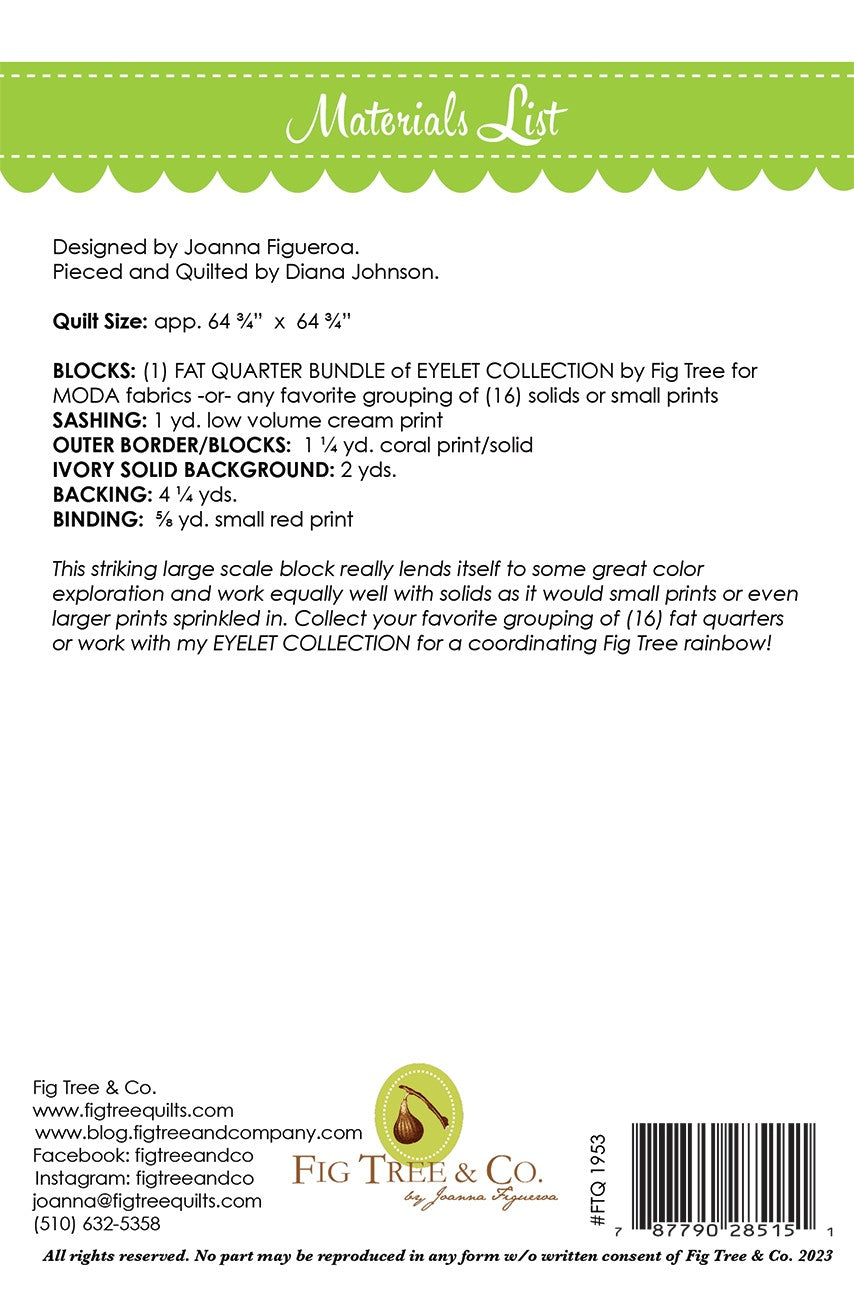 The moment I saw the first bundle of my new EYELET basics arrive on my doorstep, I saw giant flowers in a rainbow of colors. Creating a medley block from a few of my all-time favorites was a fun creative process for me and I really love the result! I feel like the large scale of the blocks and the array of solid feeling colors makes for a really enticing combination. Each block is like its own little masterpiece and the blocks are the perfect size if you ask me…. not too small and not too large!