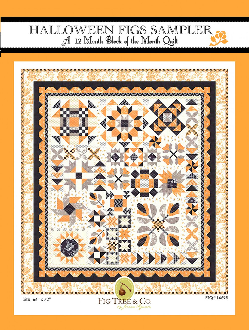 A classic Halloween Sampler in the Fig Tree & Co tradition… full of classic blocks in a variety of sizes from 6” to 15” blocks. All blocks pieced with our simple straight forward piecing techniques with no templates or fancy rulers. Applique instructions provided for the starch method of appliqué for the big chunky appliqué pieces make your introduction to appliqué simple and seamless. This sampler is created with our halloween collections for MODA fabrics, ALL HALLOW’S EVE and full color information for the fabrics are given inside the pattern. However, any good grouping of blacks, creams, oranges and grey can be used to make this heirloom project. Pattern has been broken down into 12 monthly installments and can easily be used by a friendship grouping for a BOM program. Size 66 x 72