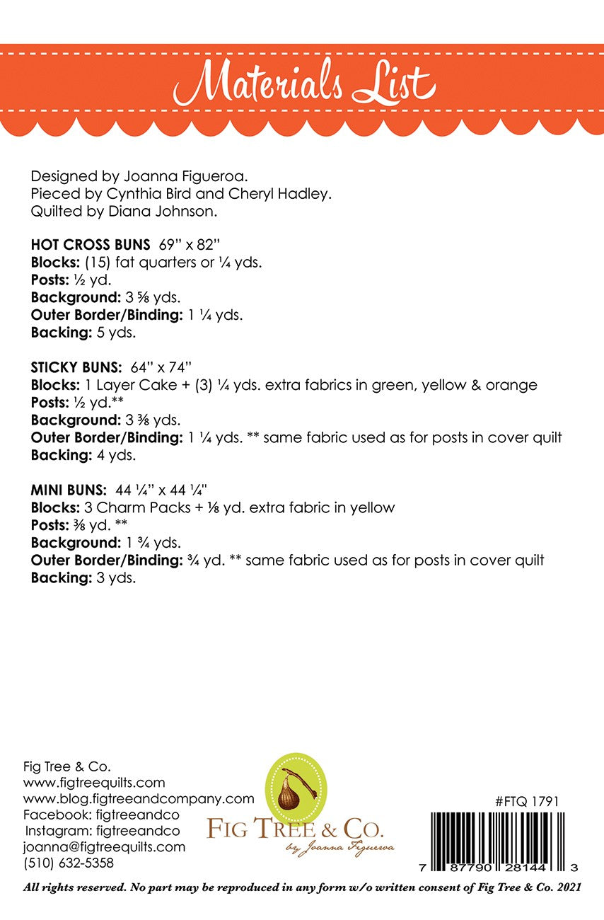 There is something about this pattern that really appeals to every part of my "design brain"! It is a simple and straightforward construction, it really shows off each and every piece of fabric and it gives you the illusion of much more work than it really is. Its my favorite kind of pattern and one of those that came out exactly as I had envisioned it in my head... which is always so awesome! I've included three different block size options:12", 9" and 6", each can be made with a different pre -cut, fat quarters, layer cake and charm packs respectively. So many fabulous options with this great pattern... plus who doesn't love a Hot Cross Bun, or better yet, a Sticky Bun! Quilt Sizes: 69in x 82in, 64in x 74in and 44in x 44in