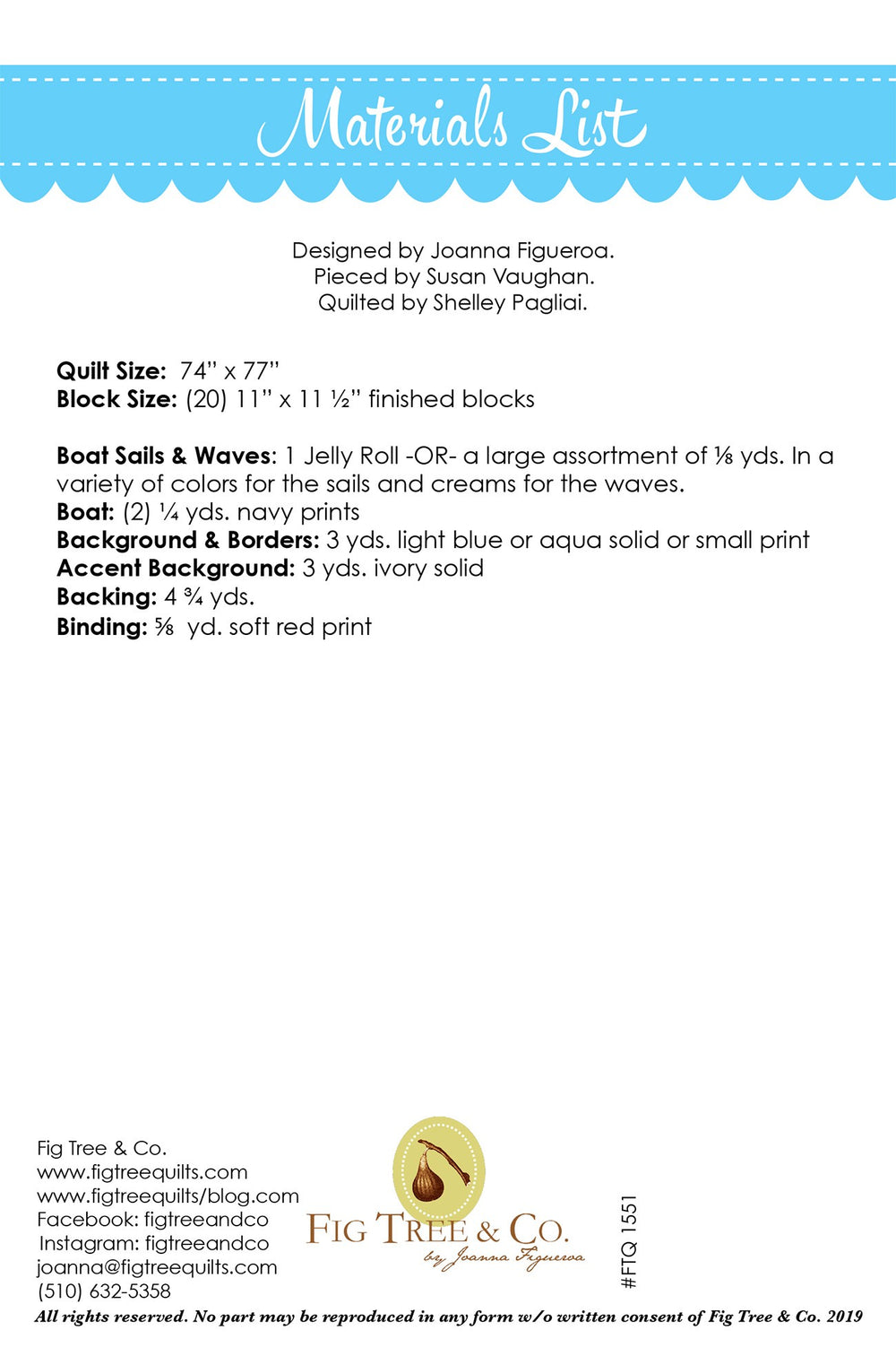 One jelly roll is all you need to create this particular Regatta- what could be better than to have all of those strips cut for you? Fun method for strip piecing the sails with no waste and no specialty rulers or difficult techniques. Pair with a few of your favorite backgrounds and create a Regatta of your own in no time! Quilt Size: 74" x 77"