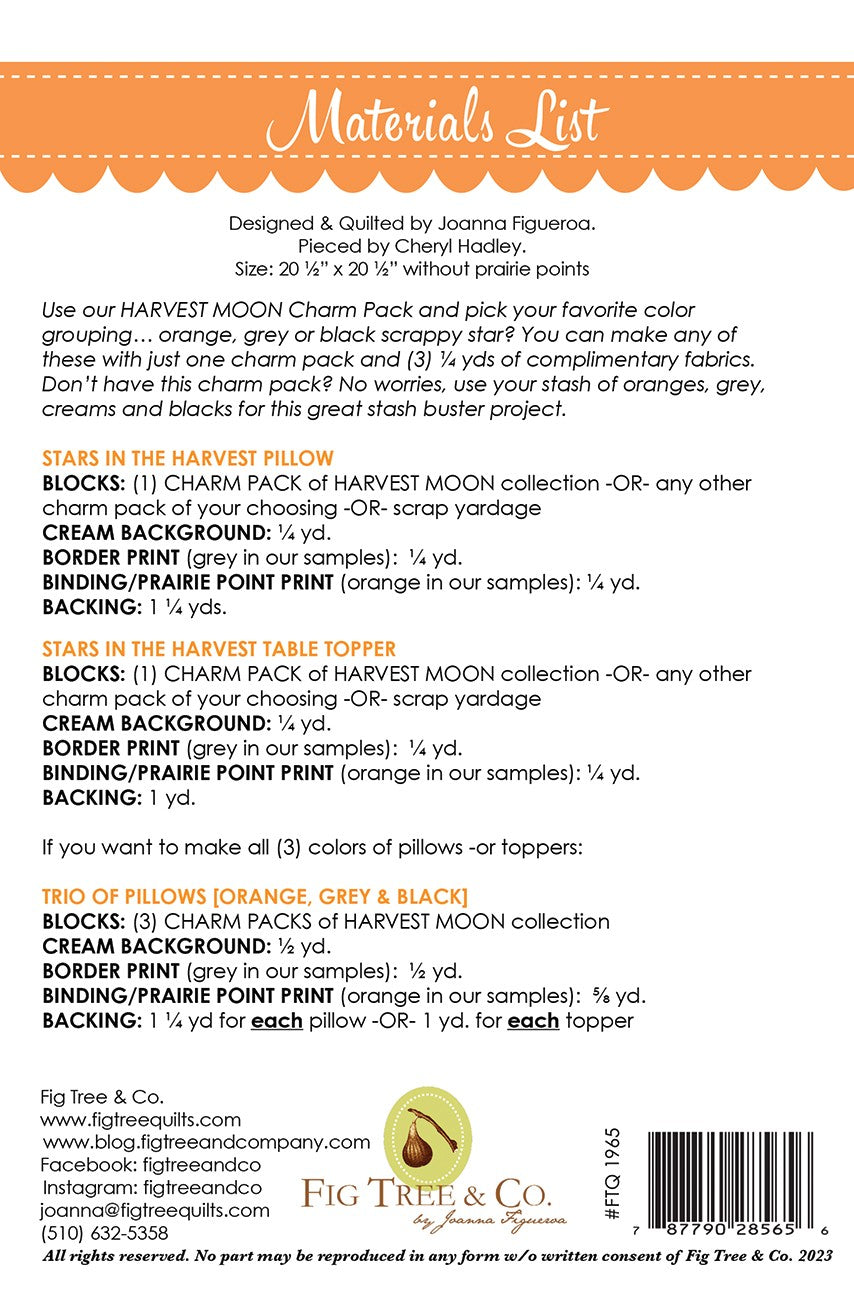 Pillows are one of my all time favorite "quick projects" and seasonal pillows are even better. In an instant, your living space can be updated & fresh for whatever season and mood you are in. For this project we used a HARVEST MOON CHARM PACK but of course any grouping of fabrics in coordinated colors would work wonderfully! Choose your color family and create your orange, grey or black themed project.
