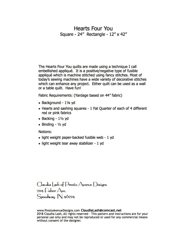 The Hearts Four You quilts are made using a technique I call embellished appliqué. It is a positive/negative type of fusible appliqué which is machine stitched using fancy stitches. Most of today’s sewing machines have a wide variety of decorative stitches which can enhance any project. Either quilt can be used as a wall or a table quilt. Have fun!
