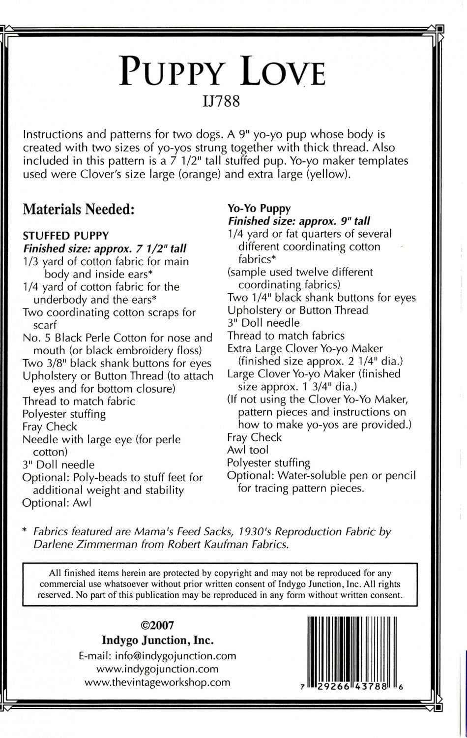 Instructions and patterns for two dogs. A 9� yo-yo pup whose body is created with two sizes of yo-yos strung together with thick thread. Stuffed yo-yos make the paw and tail. Also included in this pattern is a 7 1/2� tall x 7 1/2� long stuffed pup. Yo-yo maker templates used were Clovers size large and extra large which can be seen at item number 8702CV.
