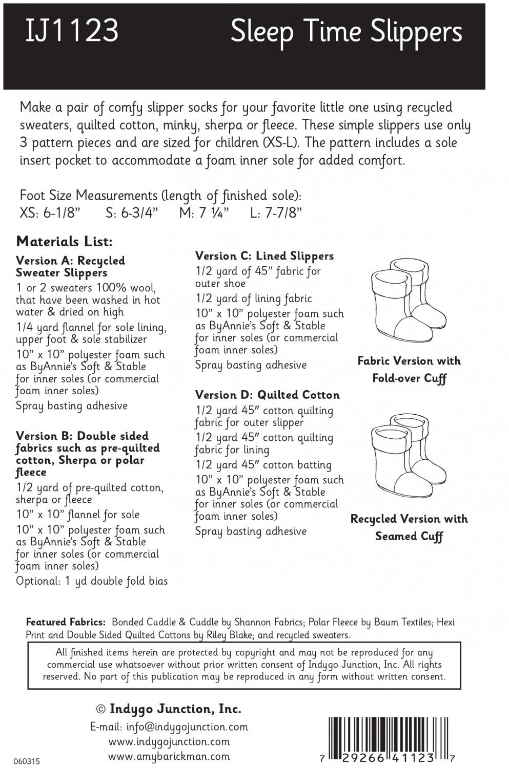 recycled sweaters, quilted cotton, minky, sherpa or fleece. These simple slippers use only 3 pattern pieces and are sized for children (XS-L). The pattern includes a sole insert pocket to accommodate a foam inner sole for added comfort.