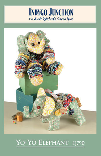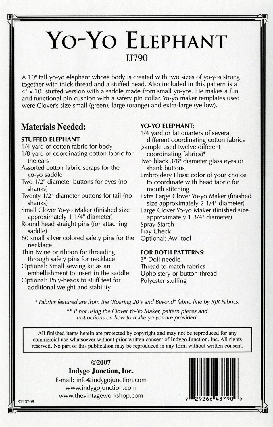 Instructions and patterns for two adorable elephants. A 10� tall yo-yo elephant whose body is created with two sizes of yo-yos strung together with thick thread and a stuffed head. Also included in this pattern is a 4� x 10� stuffed version with a saddle made from small yo-yos. He makes a fun and functional pin cushion with a safety pin collar. Yo-yo maker templates used were Clovers size small (green), large (orange), and extra-large (yellow) which is available at item number 8702CV.
