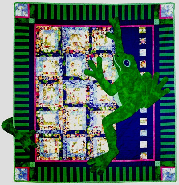 Splayed alongside colorful log cabin blocks, our 48″ tall frog is needle-turn appliquéd in all his green glory. Courthouse steps blocks set the color scheme for this not-to-be-forgotten design. A friend of equal size on quilt back elbows one arm around to the front for yet another twist on this quilt block favorite.