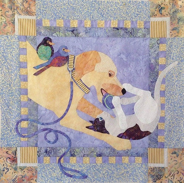 BOTH IN ONE PATTERN, “Go Fetch” is our new  wall hanging in two versions. Choose the all-dog quilt or the combination cat, dog and bird piece.  Applique’ using fusible or traditional methods on the pieced background. Special instructions for eyes, leashes and collar “hardware.”  This playful quilt brings joy to any room.