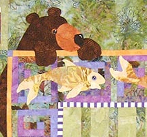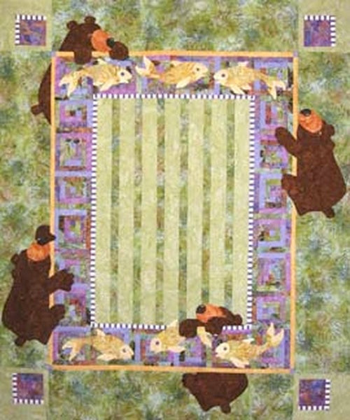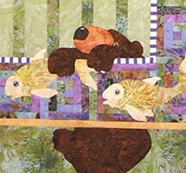 A delightful romp of bears and fish in this colorful lap quilt. Combine blue, green and purple prints and batiks in the courthouse steps piecing with deep brown appliqué bears for this clever climb in the woods. Pull out those soft golds and yellows to make beautifully contrasting fish.