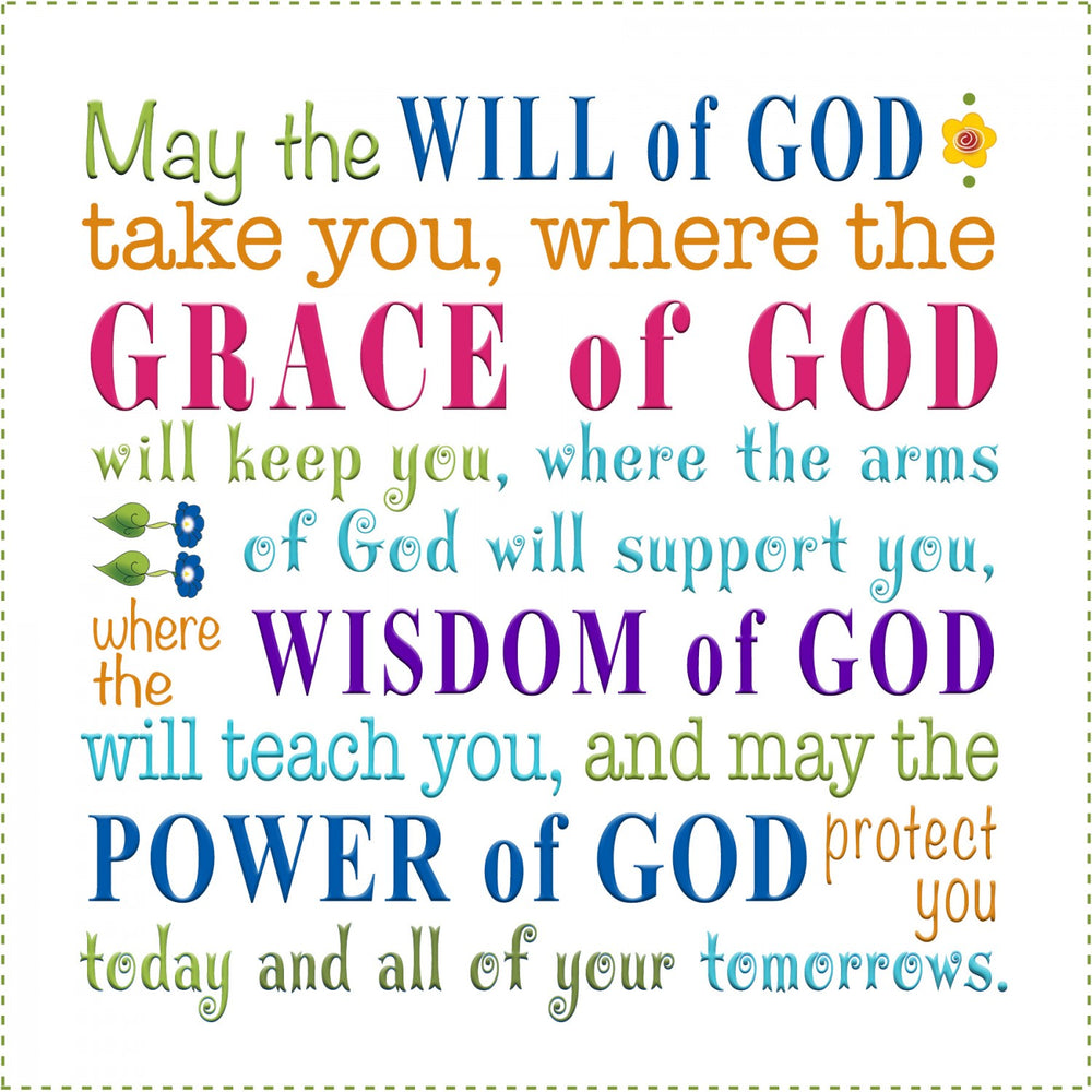 Design features the phrase, "May the Will of God take you, where the grace of God will keep you, where the arms of God will support you, where the wisdom of God will teach you, and may the power of God protect you today and all of your tomorrows."