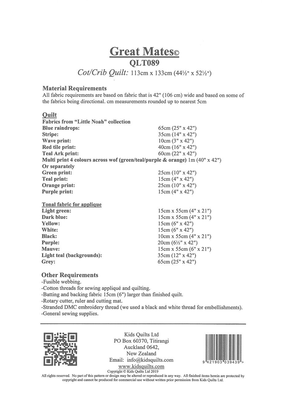 Crib Quilt 44-1/2" x 52-1/2" Great Mates is a bright funky babies crib quilt with gorgeous applique animals for little girls or boys. This design has been made from the Nutex fabric range Little Noah by Kids Quilts.