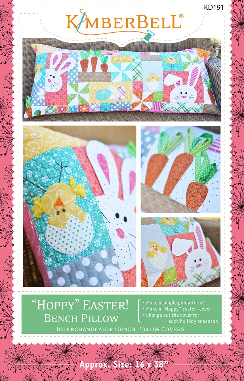 Peek-a-boo bunnies and downy chicks join the parade of pretty pastels for Kimberbell’s newest release in our popular Bench Pillow Series. The Hoppy Easter Bench Pillow features pieced and appliqued blocks with darling dimensional elements. We love the polka dot glitter eggs and fringed fluff for wings on the just-hatched chickens. Floppy bunny ears are stitched separately, then attached to each adorable face under the applique in both sewing and machine embroidery patterns. Sprouting copper carrots are made from glitter applique too, with loops of green ribbon forming the carrot tops.
