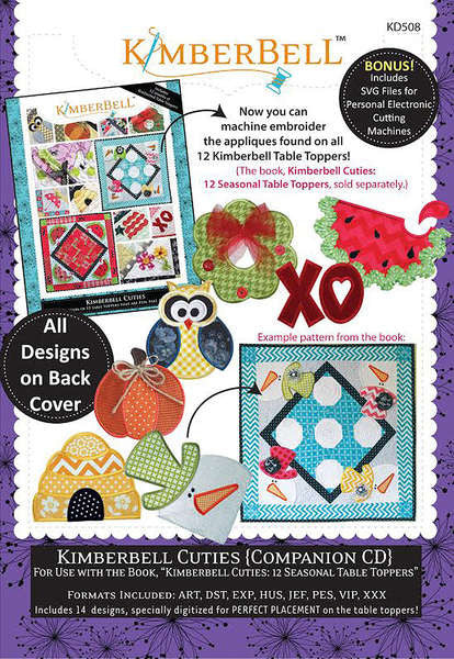 Now you can machine embroider the appliques found on all 12 Kimberbell Table Toppers! These designs have been specially digitized for perfect placement on the table topper every time! No special tools are needed for making certain the appliques are in the right place and on point in each corner. An approximate 7 x 8 embroidery field is needed for each applique design. This CD also include BONUS SVG files for use with an electronic cutting machine! 14 designs include such appliques as snowmen, pumpkins, watermelon, and more! There are 2 design options for July: A flag for the 4th of July or a maple leaf for Canada Day, July 1st. This companion CD is for use with the book, Kimberbell Cuties: 12 Seasonal Table Toppers which is sold separately and can be seen at item number KD701 . Designs come in 8 different file formats: ART, DST, EXP, HUS, JEF, PES, VIP, and XXX.