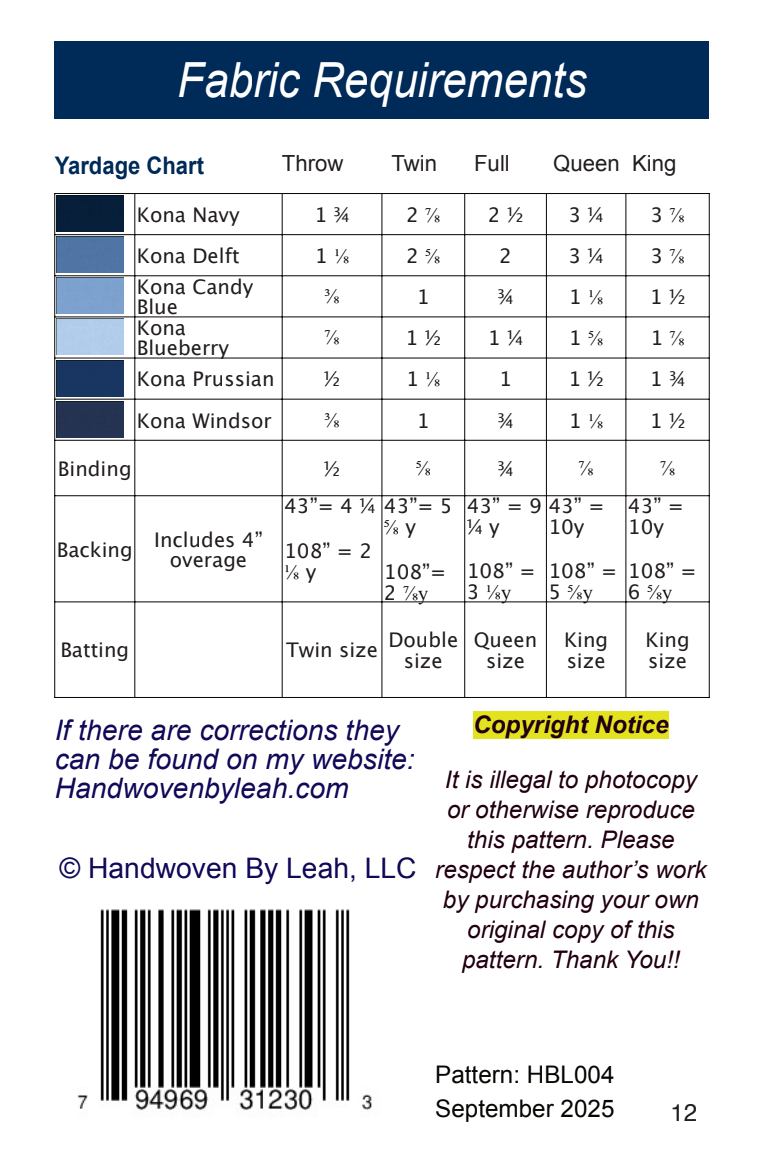 Quilt sizes: Throw - KingRequired Materials: Cotton quilting fabric in 6 colors, batting and sewing supplies.