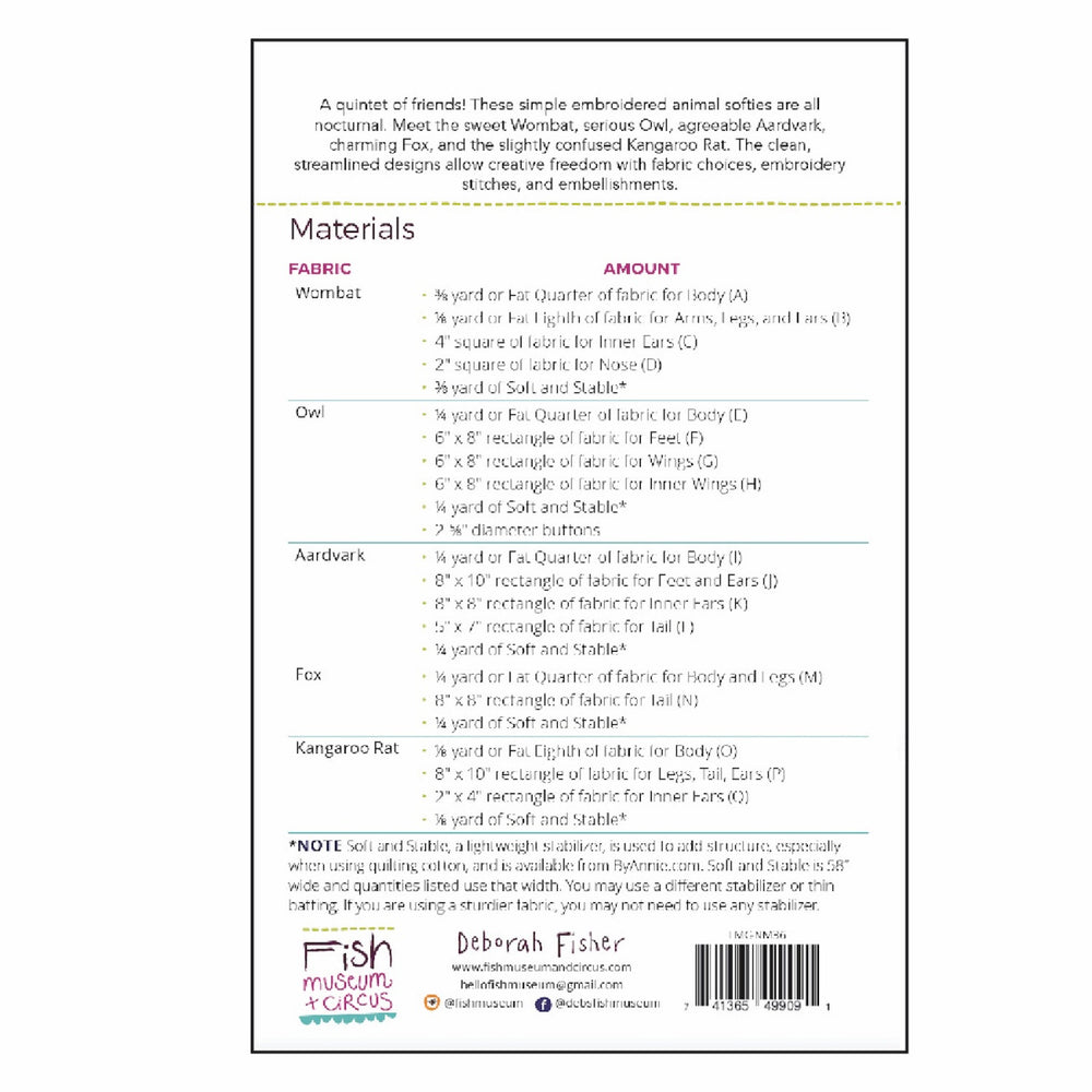 A quintet of friends! These simple embroidered animal softies are all nocturnal. Meet the sweet Wombat, serious Owl, agreeable Aardvark, charming Fox, and the slightly confused Kangaroo Rat. The clean, streamlined designs allow creative freedom with fabric choices, embroidery stitches, and embellishments. Finished Size: Wombat 15” tall, Owl 10 ½” tall, Aardvark 19” from tip of nose to end of tail, Fox 13 ½” tall, Kangaroo Rat 9” tall