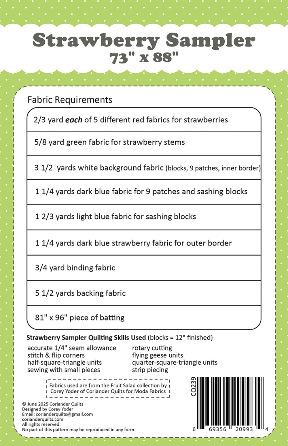 Strawberry Sampler is a full color booklet style pattern with detailed instructions and color illustrations. The Strawberry Sampler Quilt features the Fruit Salad fabric collection by Corey Yoder of Coriander Quilts for Moda Fabrics. Strawberry Sampler finishes at 73 x 88.