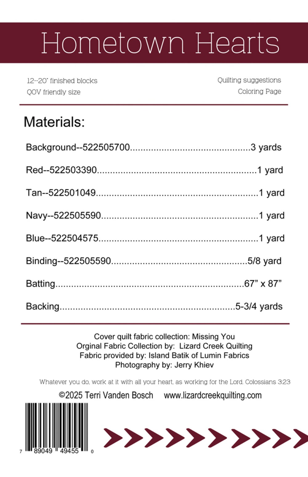 Hometown Hearts was inspired by Dad’s service, but in a way that feels warm and personal rather than overtly military. The design has a playful, farmhouse-inspired Stars and Stripes feel, with a heart nestled in the center of the star, symbolizing the pride he took in his service and the love at the core of his life. Hometown Hearts reflects his values of faith, family, and freedom. Its cheerful, patriotic design makes it perfect for spreading out at a Fourth of July picnic or gathering with loved ones. Would look great in Christmas or Fall colors also. Large 20 blocks make for quick piecing. Measures 63 x 83--QOV size. Cover quilt is made with my original batik--Missing You--by Island Batik with Lumin Fabrics.