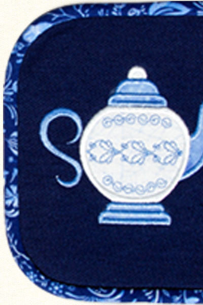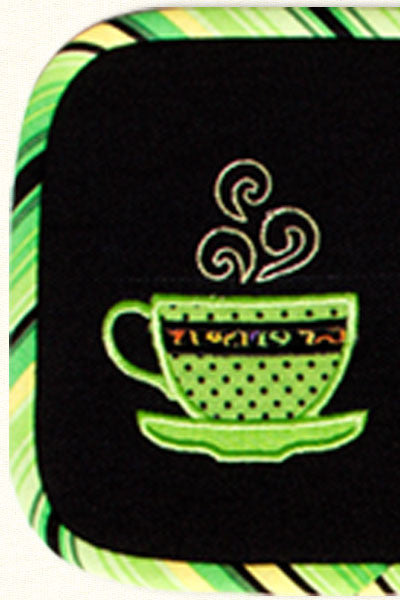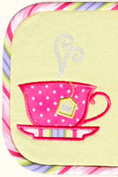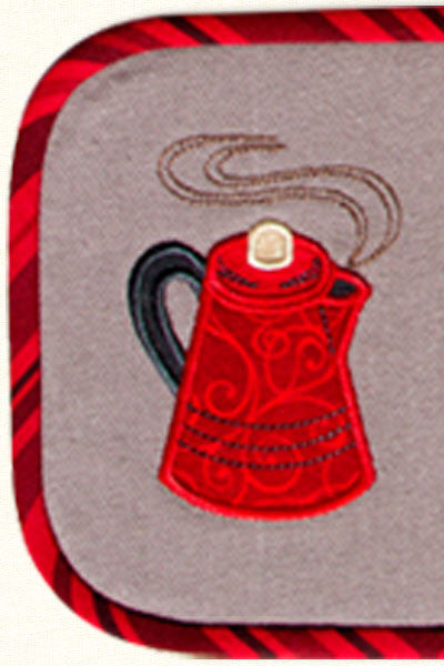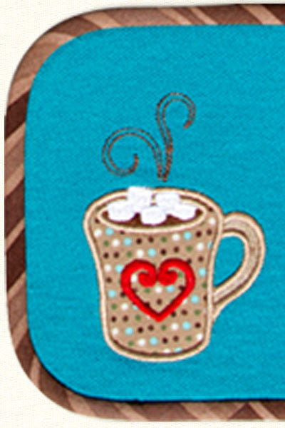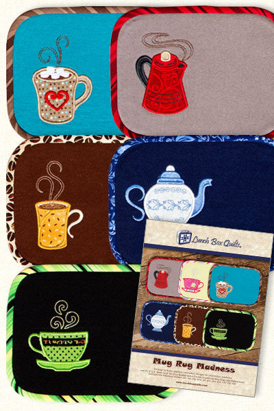 Bigger than a coaster, but the perfect size for your mug and a snack. Mug Rug Madness includes six embroidery applique designs, Tea Pot, Coffee Pot, Tea Cup, Hot Chocolate, and two separate Coffee Cup designs.