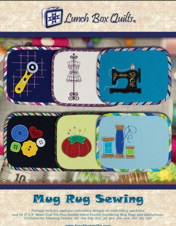 Stitch up a sewing mug rug for yourself or a friend. Choose from six different sewing themed applique designs. The sewing mug rugs finish at 6” x 8” with a Bosal Mug Rug Craf-tex form.