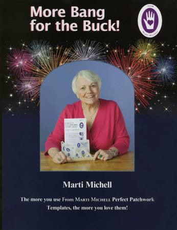 More Bang for the Buck! is our new Template ABCs� book. One of the best features on the book is a set of strip charts for 18 sets of our templates that make square blocks. But there is more to help you get more bang for the bucks you spend on templates! Inside this book, you will learn: ¢ More ways to use Perfect Patchwork Templates Set A, B, C, D, E, L, M, N, O, P Q, R, S, T, Strippers, Storm at Sea Diamond Template Set and/or the From Marti Michell Flying Geese Ruler, ¢ Ways to convert ruler-cutting instructions to template cutting ¢ Rotary cutting tips - More specifically, template rotary cutting tips! ¢ Why and how to cut strips the Marti Way ¢ Ways to teach your templates magic tricks for cutting shapes that have no template ¢ Tips for cutting connector blocks ¢ Why you want to be a Grainline Geek! ¢ Why 1.414 is a quilters favorite number ¢ How to calculate fabric requirements - or just use the Strip Yield Charts! ¢ To make Four Patches the Marti Way -Its faster than strips! ¢ To use the versatile Patchwork Trio in hundreds of block designs ¢ Why Square Within a Square units are so easy and accurate with templates And you can practice new techniques by making the Toad in a Puddle quilt shown on the back cover (scroll down to see the photo). You will also learn to convert ruler-cut designs in books and magazines to templates... why cutting with desired grainline in mind is important... how to figure out how much yardage you need to make the quilt you want to make... using templates to cut shapes for which no templates exist... and ways to improve rotary cutting accuracy and efficiency.