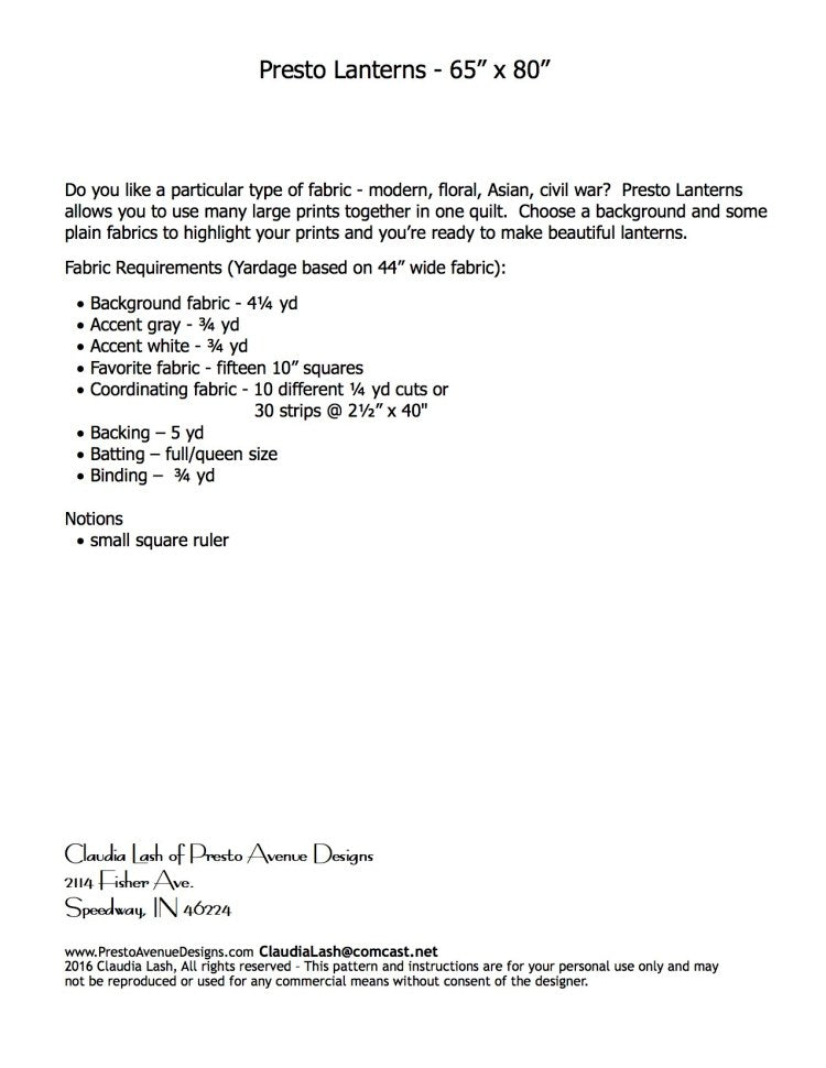 I love many of today's modern fabric prints. The Presto Lanterns quilt allows the quilter to use small sections of several big prints together in one quilt. You can use 15 different 10” squares, some coordinating solids, a background fabric and you are ready to go. The piecing is not difficult and you may enjoy as I did watching each lantern come to life.