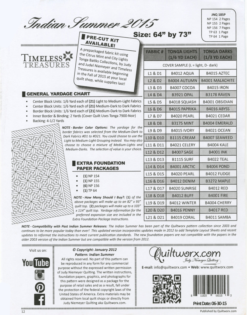 64in x 73in The Indian Summer pattern has been in the Quiltworx line of patterns for over 10 years. The pattern has been updated to incorporate new techniques and methodologies several times over the past years. The latest update includes a new coversheet using Timeless Treasures batiks designed by Judy and Judel Niemeyer, including the Citrus Mint and City Lights collections. Expansion Set available at item number JNQ185E.