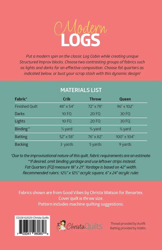 Modern Logs is offered in 3 sizes (Crib, Throw, or Queen), made from 20, 40, or 60 fat quarters where half are light/low volume and half are dark or more saturated.
