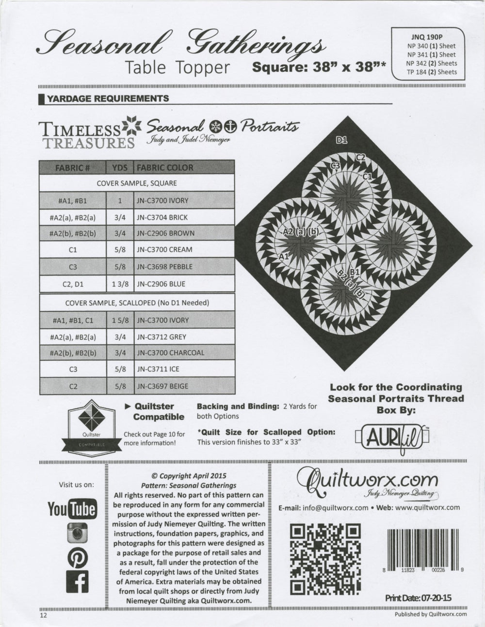 The Seasonal Gatherings Table Topper is a new layout for the Quiltworx Circling Geese block. That creates two possible 4 x 4 overlapping circlular layouts, one with a squared off border and the other with a scalloped border. These units show up in many of our other popular designs, including the Seasonal Table Runner, the Celtic Sunrise, the Autumn Splendor, and even the Glacier Star. The pattern features the latest fabric collection designed by Judy and Judel Niemeyer called Seasonal Portraits, from Timeless Treasures.