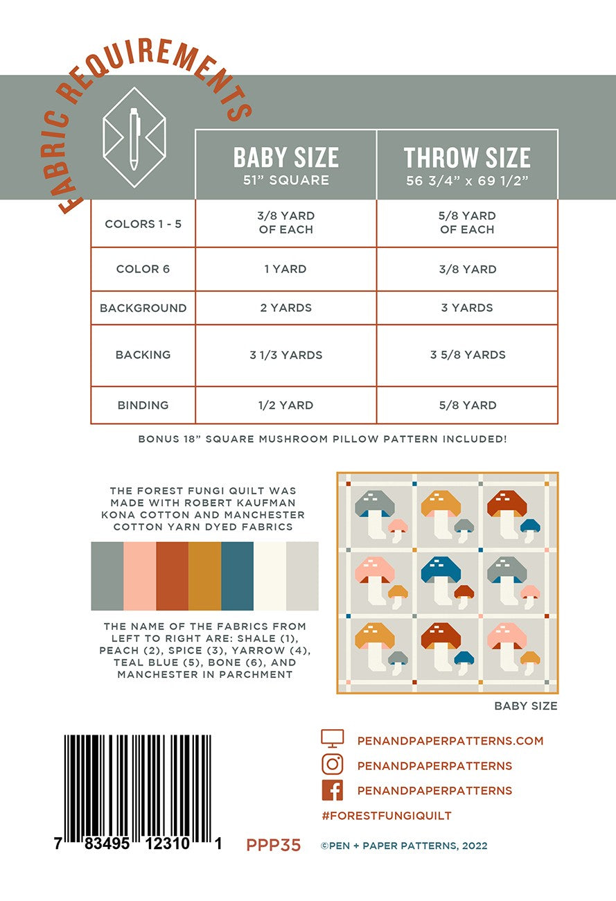Forest Fungi is a woodland inspired, traditionally pieced quilt that can be made in two sizes: Baby (51" square) and Throw (56 3/4" x 69 1/2"). The pattern includes bonus instructions for making an 18" square zippered pillow using the Mushroom block as well!