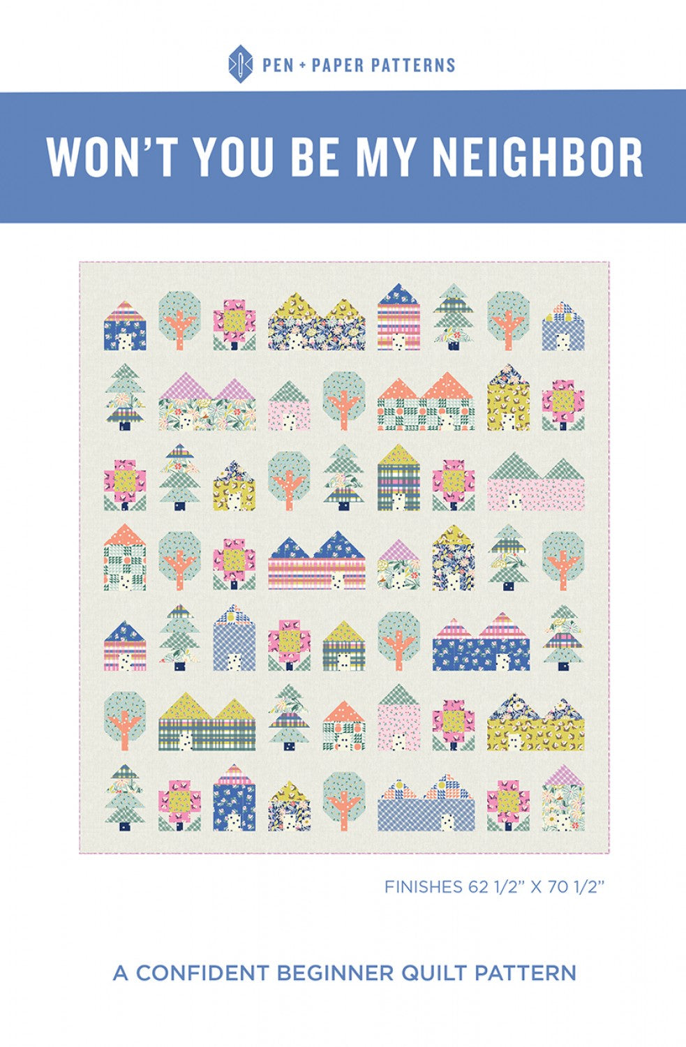 The Won't You Be My Neighbor quilt pattern is a traditionally pieced house quilt pattern that features three different house blocks, two tree blocks and a flower block. The quilt is easily customizable, fat quarter and fat eighth friendly, and finishes 62 1/2" x 70 1/2".