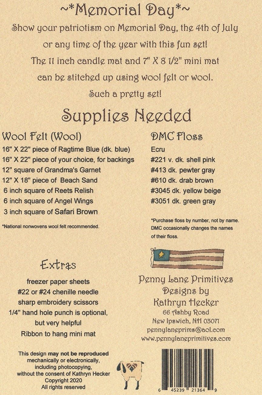 Show your patriotism on Memorial Day, the 4th of July, or any time of the year with this fun set of Americana! The 11 inch candle mat and 7" X 8 1/2" mini mat can be stitched up using wool felt or wool. Such a pretty set!