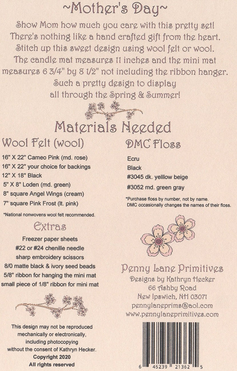 Show Mom how much you care with this pretty set! There's nothing like a hand crafted gift from the heart. Stitch up this sweet design using wool felt or wool. The candle mat measures 11 inches and the mini mat measures 6 3/4" by 8 1/2", not including the ribbon hanger. Such a pretty design to display all through the Spring & Summer!