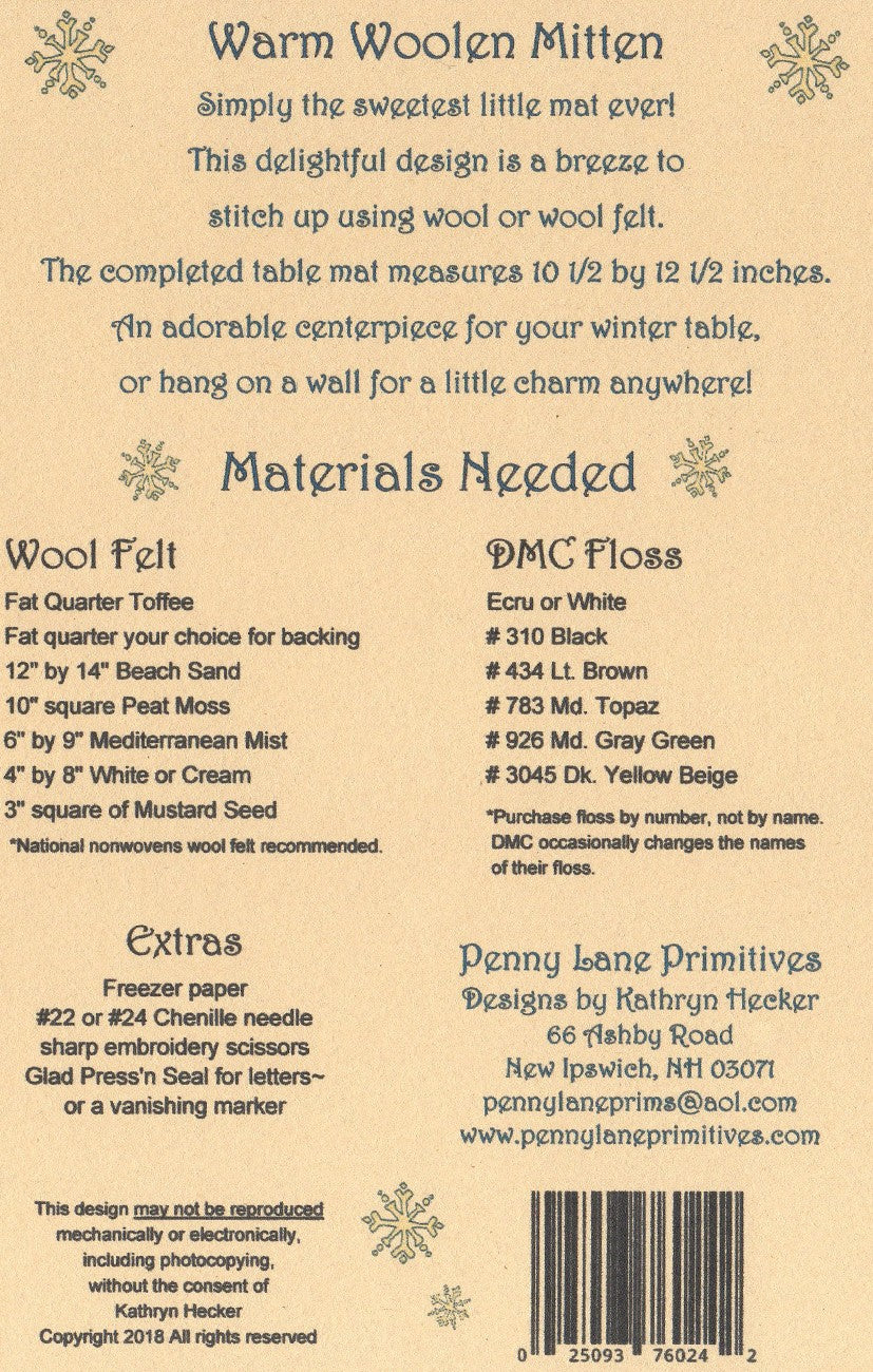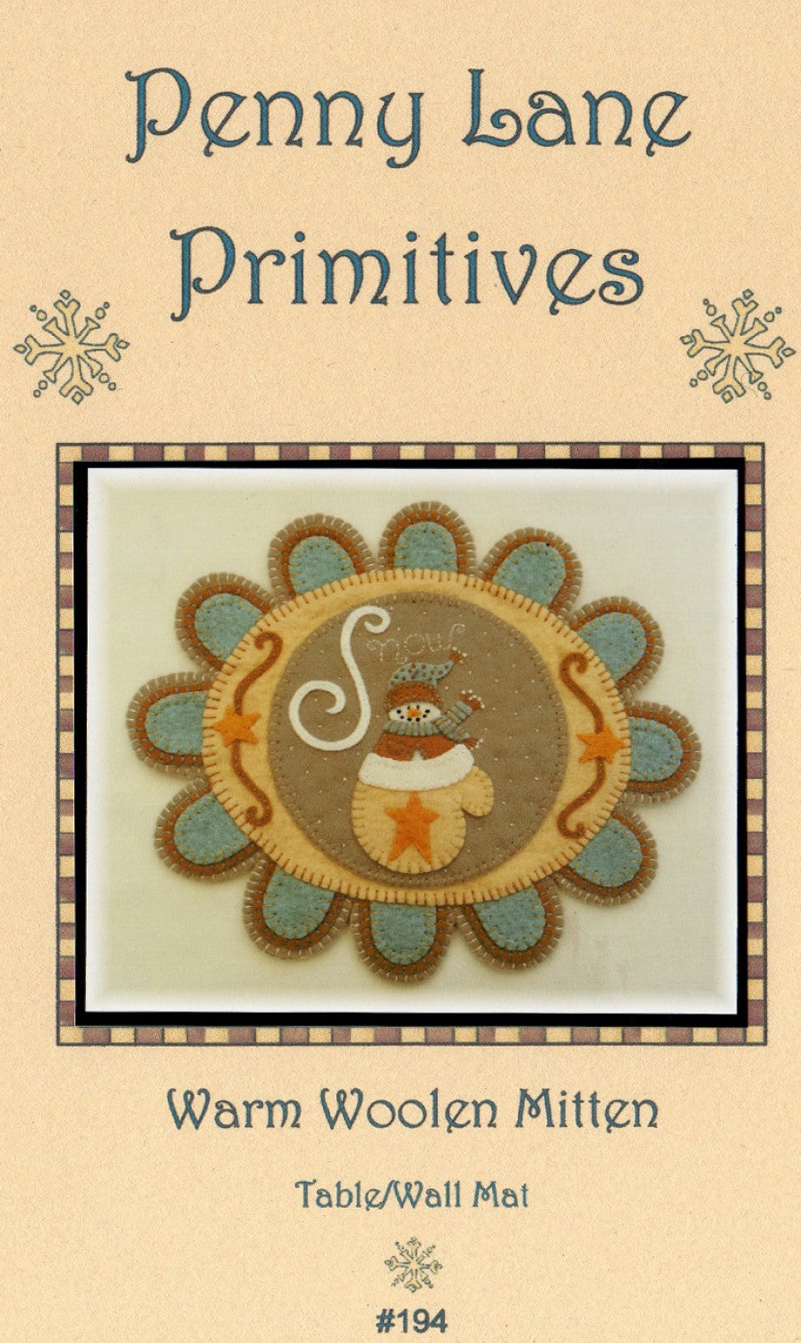 Sweet wool applique snowman in a winter mitten! Finished mat measures 10 1/2 inches by 12 1/2 inches. Display on a little table or hang on the wall with a pretty ribbon!