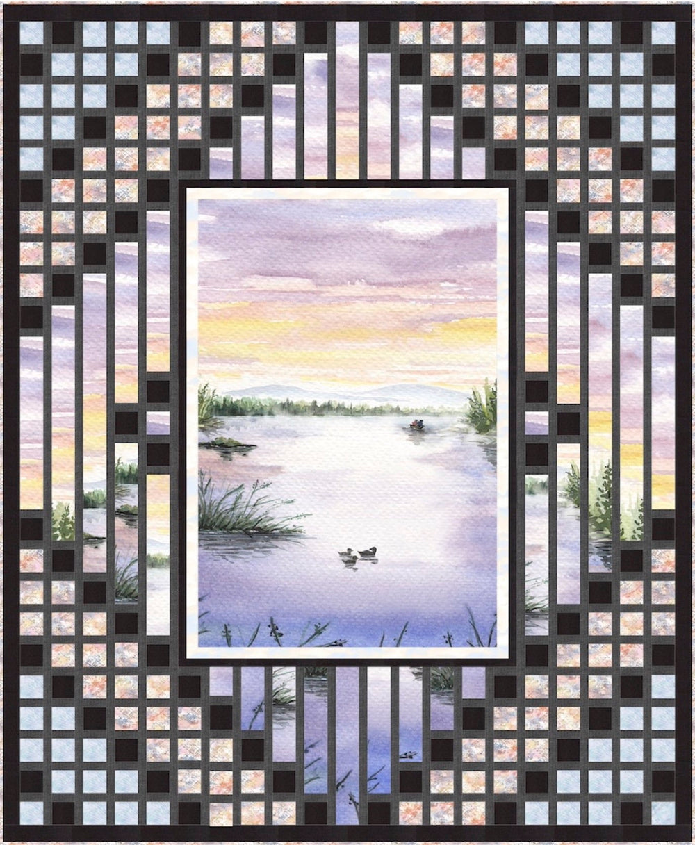 Landscape print running yardage is used for the center and much of the piecing of this quilt. Strip sets make the corner piecing.
