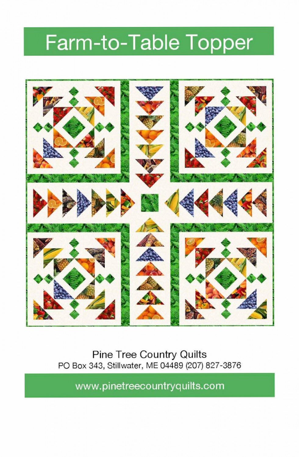 42"-square topper that uses 8 fat quarters of fruit and vegetable prints. Sample uses the Food Festival collection from Elizabeth’s Studio.