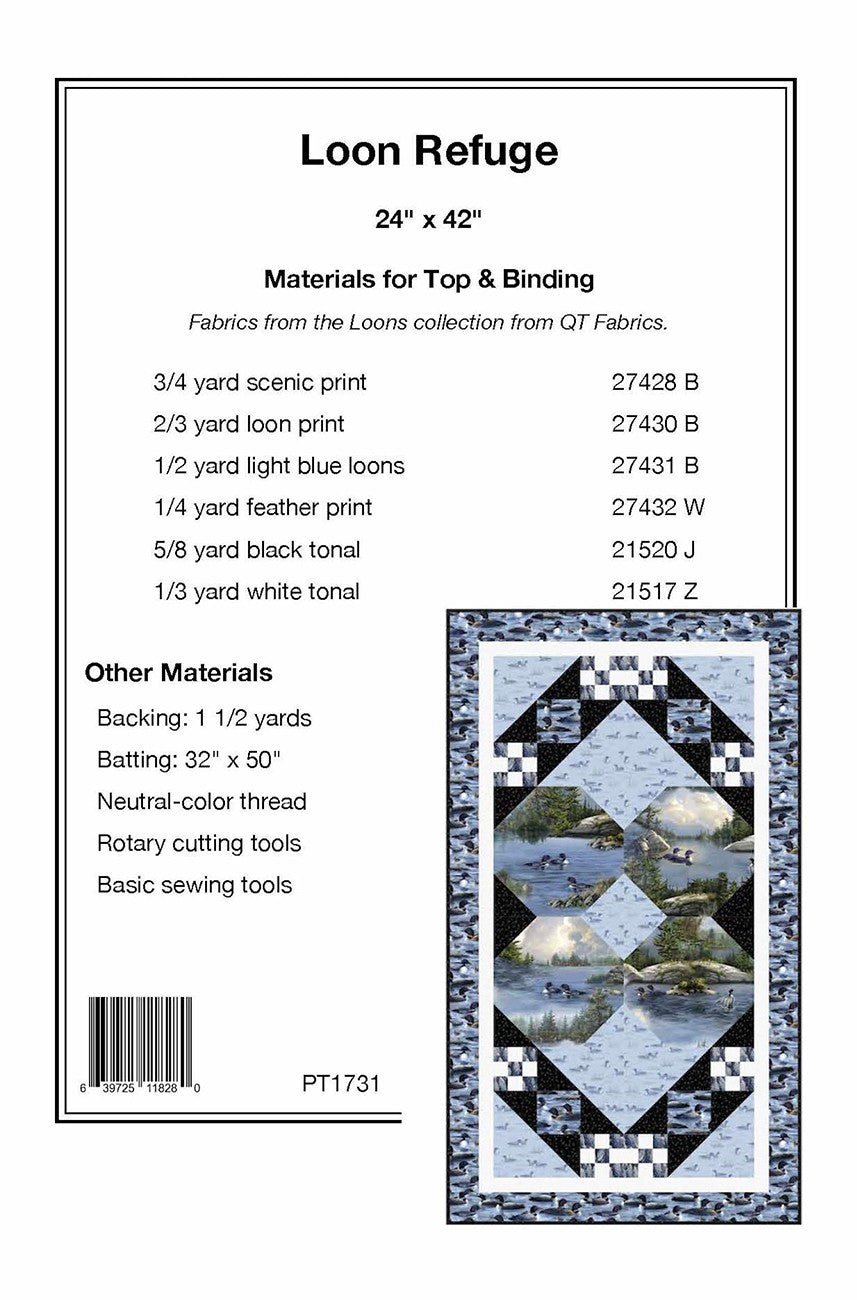 Quick to piece 24" x 42" wall banner made with the Loons collection from QT Fabrics. Fussy-cut a scenic print for the center Snowball-style blocks and add an allover print to the center of Jacob’s Ladder blocks. Skill Level: Confident Beginner
